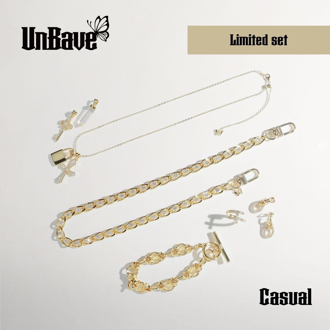 YUTA初プロデュースブランド「UnBave」から4種のチャームを組み合わせて楽しむことができるネックレス、華やかな印象のピアスまたはイヤリング、ブレスレット、クロスモチーフのリング、さらにマルチチェーンまでセットになった真鍮素材のアクセサリーをコンプリートできるセット。※マルチチェーン含まれます。